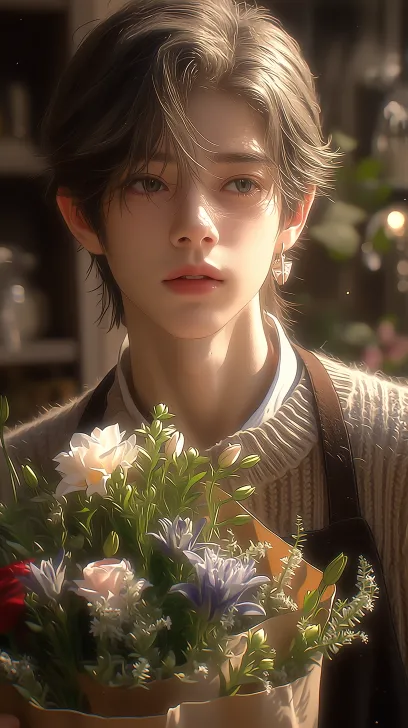 Midjourney Bot 更新时间:2026-03-08 00:16高级cg插画,2.5D,油画拟真厚涂,bjd,精致眉眼,8k超清,男性,画面采用近景镜头,聚焦在一位皮肤白皙光泽、仿真质感的男性面部。奶茶色柔顺长发,扎着低马尾,眼神灵动而有光,神情深情,展现出慵懒松弛的气质。身穿针织衫,深棕色围裙,头发随意自然。画面运用大师级的非常规独特构图,营造出光影斑驳、虚焦的氛围,柔和灯光与全息效果增强了整体的梦幻感。人物佩戴精致配饰,抱着摆放大束牛皮纸包的花朵与绿植。背景是花店,整体画面具备电影质感的胶片摄影效果,带有独特颗粒感,高饱和度与高对比度让氛围感染力拉满,呈现高级质感,画质超高清,细节处展现细腻的真人皮肤纹理,营造温馨艺术氛围与古典油画般的质感。棕色系色调。 --ar 9:16 --c 32 --weird 187 --stylize 992 --niji 7 --no no