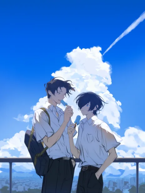 Midjourney Bot 更新时间:2026-03-08 00:17https://images.gogpt.vip/aigf/m_origin/20260308/128547/iaeaz6zlpslyqcy8.png 夏天,强光,2个日本高中男生站在天台吃冰棍,正面,背景是湛蓝的天空和积雨云,城市远景,营造出一种青春阳光氛围。较高的男孩黑色短发,穿着白色衬衫和背带黑色长裤,另一个男孩蓝色短发穿着短袖白色衬衣,黑色裤子,画面左边的黑发少年温柔地看着右边的蓝发少年。整体风格具有现代感,结合了动画和青春的元素。 --ar 3:4 --stylize 100 --niji 7 --no 背对观众,背对,