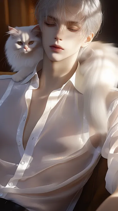 Midjourney Bot 更新时间:2026-03-08 00:20(最高画质, 8K, 超精细细节), 写实风格,28岁亚洲男性, 冷白皮, 妖孽冷艳气质, 银色微湿碎发, 半睁着迷离的眼, 微张的唇, 白色宽松薄纱衬衫, 领口微敞, 露出胸口和手臂, 一只蓬松的白色长毛猫安静地趴在他的肩膀上, 红眼睛, 姿态慵懒又带着压迫感, 坐在现代轻奢风格的客厅沙发上, 暖调室内灯光, 伦勃朗光, 丁达尔效应, 胶片颗粒, 构图为中景特写, 油画重彩和水墨渲染,CG厚涂,BJD,超细腻的画面细节,究极细节 氛围感,32K,超逼真的皮肤纹理,超级详细,高度细节,注重细节,明暗对比,究极细节,大师级光影,层次感,立体感,极致的光线,皮肤纹理细腻,3D渲染,OC渲染 电影质感,梦幻光影,肌理反光,迷离,折射光影,光影弥散,抽象表达,艺术氛围,写实风格,情绪表达和叙事 CG质感,逼真的皮肤质感,优雅迷人,时尚,动态模糊,曝光,过曝,高级,唯美梦幻,意境,颜色对比强烈,光影,极简,充满创意,文艺,时尚,艺术,抽象,高级,颗粒感,唯美,精准构图,广角镜头 肌理感,CG渲染,3d厚涂,发丝细腻刻画富有光泽 --ar 9:16 --stylize 100 --niji 7