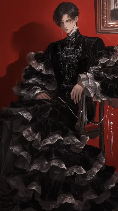 Midjourney Bot 更新时间:2026-03-08 00:24背景是红色的墙壁,一个俊美动漫男人,穿着黑色天鹅绒缎面层层叠叠旗袍+蕾丝雕花透光++立体袖+荷叶边大裙摆+珍珠和细小银链流苏点缀,身材挺拔,长身玉立,坐在椅子上 --ar 9:16 --style raw --stylize 180 --niji 6 --no no