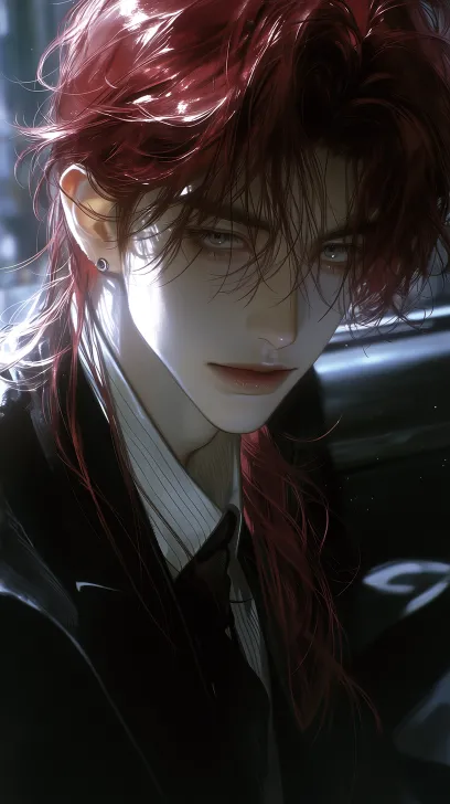 Midjourney Bot 更新时间:2026-03-08 00:25高级CG bjd 成年男性 高级厚涂 头发蓬松发丝凌乱 高清画质 光从侧面打过来 刘海过眉 冷白皮 耳环 眼尾向下 高鼻梁 薄唇 漫画感 涂画风 细腻晕染 朦胧 面部柔焦 高分辨率 笔触 插画 不羁 叛逆 嘴唇水润 俯视 立体打光 人物放大脸部特写 红色的头发 穿着黑色西装 背景街道 坐在车里 领口微微敞开 冷色调 面部特写 --ar 9:16 --stylize 800 --niji 7