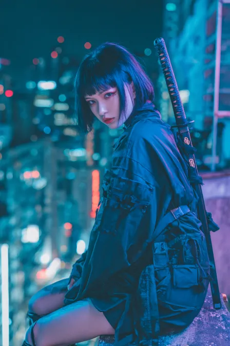 Midjourney Bot 更新时间:2026-03-08 00:26一个现代女性猎妖师,丹凤眼,短发,墨黑发色带深蓝色挑染,身穿玄青色改良短款道袍配机能工装裤,背负一把比身高还长的中式巨型重剑,剑身有发光道家符文。她坐在城市天台边缘,俯瞰夜景,气质冷冽疏离,短发被夜风吹动。赛博朋克元素与中国传统道袍融合,电影级光影,4k高清,写实风格。 --ar 2:3 --v 7 --stylize 100