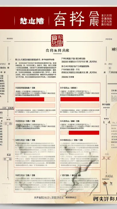 Midjourney Bot 更新时间:2026-03-08 00:27https://images.gogpt.vip/aigf/m_origin/20260308/2077201/g4gn9303qk2fihno.png https://images.gogpt.vip/aigf/m_origin/20260308/2077201/9qj7s46ihzpam6nt.png /imagine prompt: 清代内阁大库档案风格信息图表设计,竖版9:16比例,整体视觉如展开一份珍藏三百年的清代奏折。宣纸底色采用古雅的米黄色 #F5EFE0,纸张表面有细腻的竹纤维纹理,自然分布的虫蛀小孔呈现不规则圆形,边缘加深形成岁月痕迹,多处水渍晕染扩散呈不规则形状,墨色轻微褪色形成斑驳效果。 色彩系统以朱砂红 #8B3A3A 为主色,用于标题栏、重要边框、关键数据标记和右上角印章;古金色 #B76E2E 作为辅助色,用于高亮数据和装饰点缀;正文文字采用墨色 #2F2F2F,注释文字用淡灰色 #6A6A6A。 版面背景有淡淡的六行格线,每幅六行,间距均匀,线条为极浅灰色,透明度15%,模拟清代奏折的书写格式。整图有3-4条横向自然折痕线,深灰色,透明度30%,呈现折叠多年的真实质感。 右上角钤一枚方形红色篆刻印章,印章边缘有残破效果,朱砂色略有晕染,内留白位置供后期添加图号。四角点缀传统清代云纹或如意纹,线条极简,只占角落位置不干扰主体内容。 图表区域采用三段式结构布局,可用纵向色块区分不同类别,色块为长方形,朱砂红细边框,内留白供后期添加文字。右侧或底部可设竖排文字区,模仿古籍批注格式。表格采用古籍刻板风格,细红框线,内分多列,格子内留白。 整体视觉要达到博物馆展览级别质感,像故宫博物院展出的真实清代奏折档案,有历史沧桑感、学术庄重感,同时图表区域留白清晰,适合后期添加数据可视化内容和清代嫁妆主题文字。所有文字区域均留白,只生成框架和视觉元素,不生成任何具体文字内容 --ar 9:16 --v 6.0 --style raw --stylize 250 --iw 1.5 --sref https://images.gogpt.vip/aigf/m_origin/20260308/2077201/9qj7s46ihzpam6nt.png https://images.gogpt.vip/aigf/m_origin/20260308/2077201/g4gn9303qk2fihno.png --sw 174