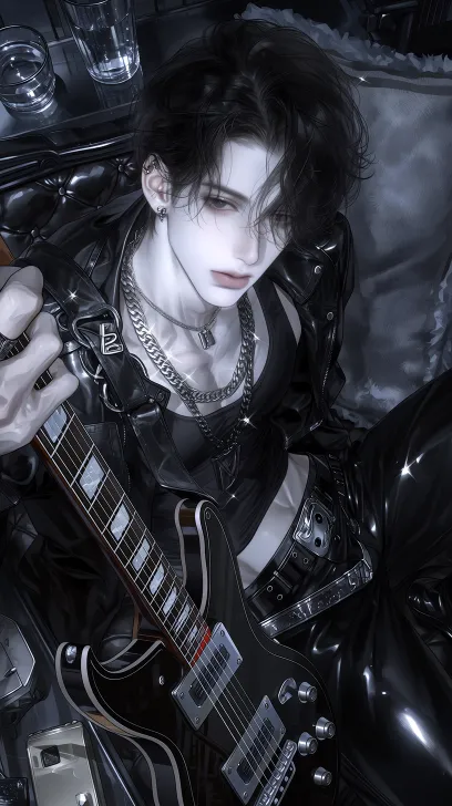 Midjourney Bot 更新时间:2026-03-08 00:292.5D伪厚涂风格 一个俊美帅气的男人 丹凤眼 黑色眼睛黑色短发 发丝微微遮住眉眼(长刘海遮住额头 M字刘海造型) 高鼻梁 薄唇 白皙皮肤(细致皮肤纹理质感)身穿黑色背心(运动款+紧身+贴身+纯黑色+腰部收紧)+ 佩戴银色链条项链(金属质感+细节细纹)+ 黑色皮带(银色金属皮带扣+皮质黑色皮带质感+细节)身穿黑色皮质长裤(细节+质感)男人手上抱着黑色系亚文化Y2K元素的贝斯吉他(造型感+细节)男人弹吉他的动作 男人身处于卧室 远景身照(大腿以上部分)鱼眼镜头 俯视鸟瞰视角 俯视视角 卧室内有灰色毛绒质感枕头、玻璃杯、啤酒瓶、烟盒 男人坐在黑夜板质沙发发椅上 冷色调 通透的质感 极致的细节 给人一种忧郁的感觉 丰富的元素细节男人身材比例极佳(模特九头身)肌肉线条流畅 肌肉发达 手指骨节分明 男人看向镜头 男人居于画面正中间 构图明确 --ar 9:16 --stylize 99 --niji 7 --profile 6f3d8rv