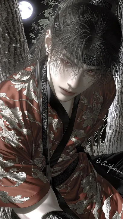 Midjourney Bot 更新时间:2026-03-08 00:358K分辨率,中景,俯视角拍摄,腹部以上半身照,正脸照片,动态构图,伪厚涂,真人感,精细肖像,通透皮肤,高对比度,低饱和度,超精细描绘,数码高清写实主义,仙侠水墨风格。一个英俊的男性,侠客,动态感,黑色长发高马尾,黑色金丝龙纹刺绣发带,鬓角两边留着几缕发丝,发丝蓬松齐腰,通透眼眸,红色瞳孔,挺直的鼻梁,浅色薄唇,衣服:红色金丝梅花刺绣长袍 叠搭着黑色腰封(腰带) 搭配着护腕/肩甲,坐在树枝上,背景是夜晚,橡树,树干,树叶,月亮,面对观众。精细发丝高光,眼部高光。 --ar 9:16 --stylize 434 --niji 7 --sref https://images.gogpt.vip/aigf/m_origin/20260228/302108/21xrmsixppu9mi7n.jpg https://images.gogpt.vip/aigf/m_origin/20260307/302108/85u19xrvx973ya61.jpg