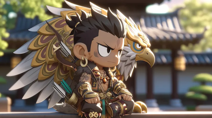 Midjourney Bot 更新时间:2026-03-09 00:00吉卜力卡通风格,猎户少年,小麦色皮肤,单眼皮锐利眼神,黑色短发扎小揪,深褐色短褐,鹿皮背心,腰间箭囊插几根彩羽,背旧木弓,左耳铜环。身旁蹲一只金色羽毛堆叠的鹰形伞,有生命感。背景清宫廷庭院,8K,三维渲染。 --ar 16:9 --stylize 100 --niji 7
