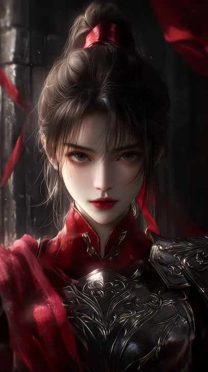 Midjourney Bot 更新时间:2026-03-09 00:00半写实风格,伪bjd质感,伪厚涂质感,高级感,氛围感,cg渲染,颗粒感,极致超清极致细节。古风女子,女将军形象,正面视角,穿大红色锦缎铠甲,黑色高束马尾发,头顶系着红丝带,浓眉,唇色深红,狭长的眼眸带着一丝英气,景深构图,七分身比例,腰部以上,人物面部焦距镜头,光影交错,突出人物面部,明暗对比强烈,烽火连天,身后是深邃的石墙城门和红色旗帜,丁达尔光,朦胧光晕。低视角构图。 --ar 9:16 --stylize 332 --niji 7 --no 低饱和,文字