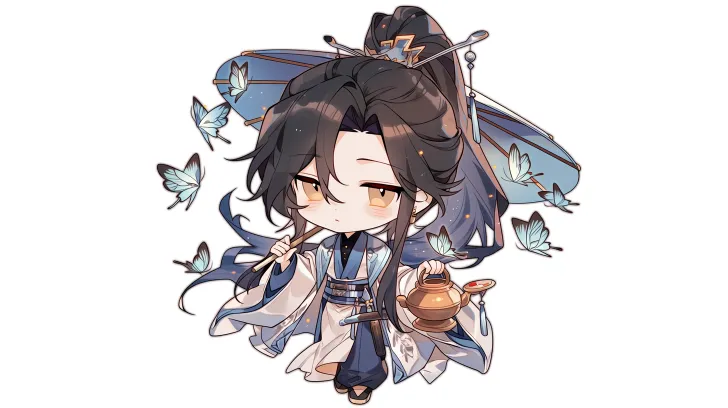 Midjourney Bot 更新时间:2026-03-09 00:00吉卜力卡通风格,画师少年,白皙皮肤,杏眼温柔,乌黑长发青玉簪绾起,月白长袍浅青短褂,腰挂青铜香炉和画轴,手指沾颜料。身旁环绕一群彩蝶翅膀组成的伞,流光溢彩。纯色背景,8K,三维渲染。 --ar 16:9 --stylize 100 --niji 7