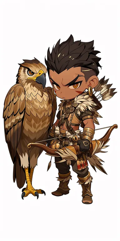 Midjourney Bot 更新时间:2026-03-09 00:02吉卜力卡通风格,猎户少年,小麦色皮肤,单眼皮锐利眼神,黑色短发扎小揪,深褐色短褐,鹿皮背心,腰间箭囊插几根彩羽,背旧木弓,左耳铜环。身旁蹲一只金色羽毛堆叠的鹰形伞,有生命感。纯色背景,8K,三维渲染。 --ar 1:2 --stylize 100 --niji 7