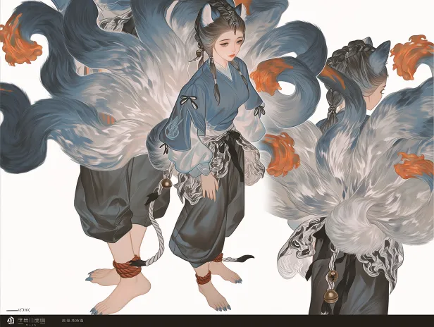 Midjourney Bot 更新时间:2026-03-06 00:28https://images.gogpt.vip/aigf/m_origin/20260305/1812908/acc4igkfebu7loc3.png 山海经神兽媢拟人化少女三视图,包含正面、侧面、背面三个视角并排排列,全身站立姿势,十六七岁,身高160cm,天真与危险并存气质 神兽特征:身后九条青灰色蓬松长尾,每条比身体长,尾尖微翘,层次错落舒展;双手指甲青灰色略长尖,蜷缩藏于指间;眼眸黑亮,眼形弯弯如月,瞳仁深处藏警觉 服装细节:青灰色短打衣衫,面料轻薄,袖口收束,衣摆至大腿中部;深灰色宽腿裤,裤脚塞入绑腿;腰后九尾根处有毛绒装饰掩盖,腰间系细麻绳坠小铜铃;赤足,脚踝系红绳,脚趾甲青灰色;青灰色长发披散,额前碎发凌乱,耳侧两条细辫 三视图要求:正面展示面部表情、手部姿态(手指微蜷)、九尾分布;侧面展示尾巴层次和身体前倾的姿态;背面展示九尾根部与腰后毛绒装饰的关系,以及发型背面 背景:纯白色背景,无阴影 风格:角色设计图,线稿加淡彩,线条清晰,细节精确,全身展示,8k高清 --ar 4:3 --stylize 87 --iw 2 --niji 7 --sref https://images.gogpt.vip/aigf/m_origin/20260305/1812908/acc4igkfebu7loc3.png --sw 307