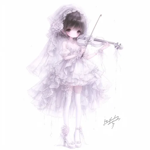Midjourney Bot 更新时间:2026-03-06 00:37平视视角,正面镜头角度,全身拍摄,一个女生站着,黑色公主切发型,头上披着一层薄薄的白色头纱,身穿白色蓬蓬裙,收腰线条装饰,手里拿着一把白色小提琴,白色高筒袜,白色小皮鞋,空中下着雨,适当缩小人物,墨渲染,精致细节,柔和的光线,氛围感,朦胧感 --ar 1:1 --seed 3627277985 --stylize 555 --niji 6 --sref https://images.gogpt.vip/aigf/m_origin/20250507/1512125/f809zjl4k14aywe6.png --profile rsxjf9z --no 不要出现短裙,不要出现草地
