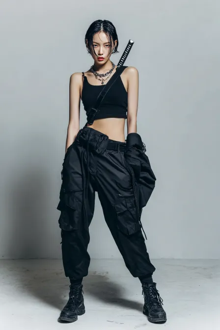 Midjourney Bot 更新时间:2026-03-06 00:401个年轻女人,24岁,身形矫健,肩背线条凌厉,齐耳短发,一缕头发翘起 黑色紧身背心,工装裤,黑色短夹克,黑色短靴 背后背着黑色长匣,左耳三个耳钉,右小臂有旧疤 眼神锐利,嘴唇抿紧,站姿笔直 --ar 2:3 --v 7 --stylize 100