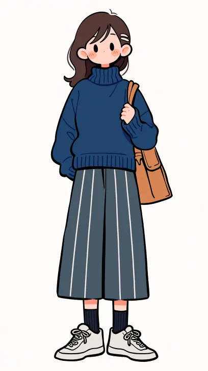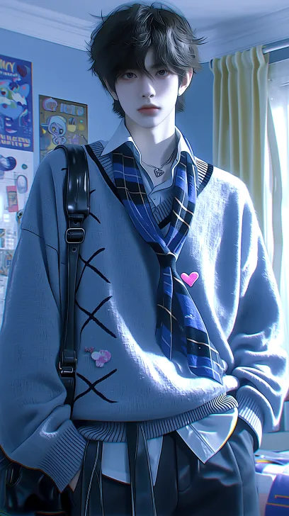 Midjourney Bot 更新时间:2026-03-06 00:48特写、大视角、半身照、帅气青年、18岁、千禧风、黑色短发、齐刘海、苍白皮肤、锐利眼神、冷酷表情、自信站立、一手搭在肩包上、一手叉腰、穿着宽松的浅蓝色V领毛衣裙,带有黑色菱形交叉刺绣图案,蓝色黑色条纹长围巾随意搭在脖子上,腰间系着多条黑色皮腰带,黑色肩包,日式街头时尚,朋克亚文化风格,工作室灯光照明。背景是一个明亮的卧室,浅蓝色壁纸,浅黄色窗帘,墙上有动漫海报,时尚摄影风格,照片上贴满可爱的贴纸,有彩虹灯光和粉色爱心特效。高清细节,8K分辨率,照片级真实感。韩国厚涂3D渲染风格,质感强烈,伪BJD娃娃脸,伪真实电影概念风格,冷色调滤镜。 --ar 9:16 --c 10 --stylize 555 --niji 7 --no looked up