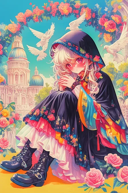 Midjourney Bot 更新时间:2026-03-06 00:42https://images.gogpt.vip/aigf/m_origin/20260226/28068/ij5cf0w0e3hzl18u.jpg 一位身穿黑色斗篷的角色,背景充满了鲜艳的粉色玫瑰花和梦幻的蓝色天空。天空中有飞翔的白鸽,整个画面营造出一种浪漫而神秘的氛围。角色的头发是柔和的白色,搭配复杂的发饰,面部细节被遮挡。背景中还有一座古老的建筑,增添了画面的层次感。整体色调明亮,充满了童趣和幻想气息。画面风格细腻,充满了丰富的细节和色彩的对比。 --ar 2:3 --stylize 100 --iw 0.25 --niji 6 --sref https://images.gogpt.vip/aigf/m_origin/20251212/28068/30ld5mr8htu11upc.jpg https://images.gogpt.vip/aigf/m_origin/20251212/28068/hcnkwo6dl99hyizn.jpg https://images.gogpt.vip/aigf/m_origin/20251212/28068/cw1fgui11vfts7bx.jpg
