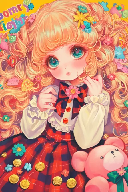 Midjourney Bot 更新时间:2026-03-06 00:43https://images.gogpt.vip/aigf/m_origin/20260226/28068/ij5cf0w0e3hzl18u.jpg 一个可爱的女孩,拥有金色的卷发和大大的蓝色眼睛,穿着红色格子裙子和白色衬衣,搭配着亮眼的红色蝴蝶结。她手中举着一颗黄色的星星,脸上洋溢着灿烂的笑容。背景是明亮的黄色,四周点缀着彩色星星,增添了欢快的气氛。旁边有一堆金色的硬币,整体画风充满了童趣和活力,色彩鲜艳且细腻。 --ar 2:3 --stylize 100 --iw 0.25 --niji 6 --sref https://images.gogpt.vip/aigf/m_origin/20251212/28068/30ld5mr8htu11upc.jpg https://images.gogpt.vip/aigf/m_origin/20251212/28068/hcnkwo6dl99hyizn.jpg https://images.gogpt.vip/aigf/m_origin/20251212/28068/cw1fgui11vfts7bx.jpg