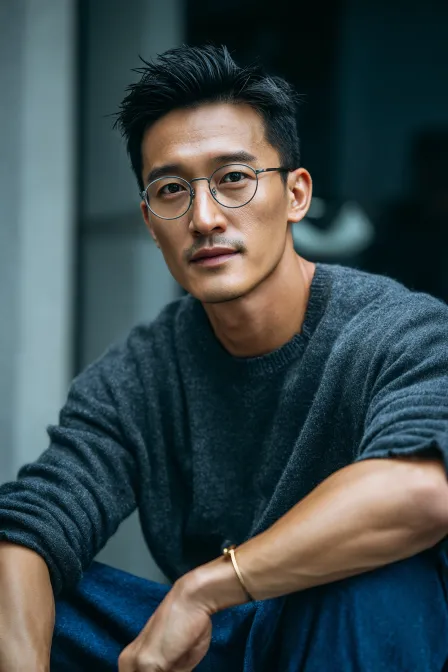 Midjourney Bot 更新时间:2026-03-06 00:431个年轻男人,28岁左右,清瘦挺拔,温和书卷气,戴细框眼镜 深灰色休闲衬衫,藏蓝色休闲裤, 手指修长,指腹有薄茧,袖口挽到小臂,露出清瘦手腕 左手手腕上戴着两只超细的金色乾坤圈 --ar 2:3 --v 7 --stylize 100