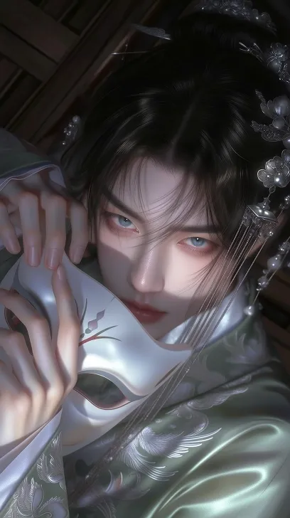 Midjourney Bot 更新时间:2026-03-06 00:45一位年轻的东亚女性,拥有白皙如瓷的肌肤和醒目的湛蓝双眼。她的长黑发被精心盘成传统的发型,配以复杂的银质花饰和悬挂的链条珠子。她身着华丽的翡翠绿色中国传统汉服,上面绣着精致的白色花卉和凤凰图案。她双手捧着半面光滑的白色面具遮住脸部,神情平静而神秘。画面采用中景视角,眼睛与主体处于同一水平线,浅景深使得昏暗的传统木质室内背景显得模糊不清。光线柔和柔和,营造出主体与黑暗环境之间的鲜明对比。整体风格空灵神秘,让人联想到带有现代数字艺术元素的中国水墨画 --ar 9:16 --stylize 369 --niji 7 --profile fte58en