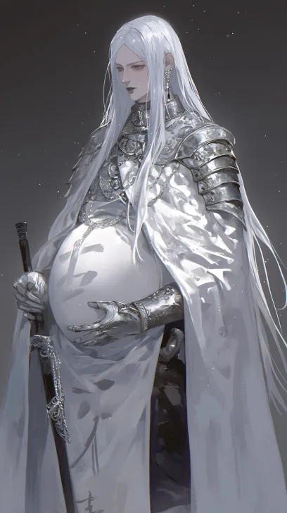 Midjourney Bot 更新时间:2026-03-06 00:53厚涂插画,哥特风,怀孕,视觉系帅哥,白色长发、齐刘海、披风、金属银色盔甲、肩甲+胸甲+护腕+链环+手套、zong教饰物、、戴着多条白色长方形书法,白色纱衣白袍 、脖子缠绕细小银首饰层叠ornament、宽肩窄腰完美肌肉线条,白色长睫毛、黑眼圈、灰色虹膜、琥珀瞳孔、M型唇、金属耳坠 、黑makeup,站着,拿着长剑 --ar 9:16 --stylize 100 --niji 6 --no no