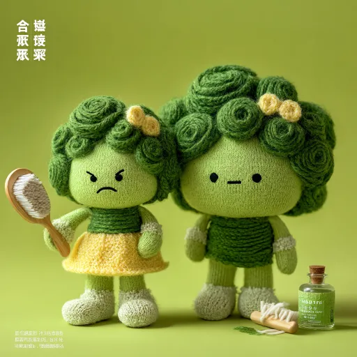Midjourney Bot 更新时间:2026-03-05 00:16可爱绿色“西兰花”毛绒玩具。圆滚滚绿色花球脑袋,每朵小花都是卷卷的羊毛卷,搭配细胳膊细腿;穿黄色公主裙,举着小镜子皱眉头,另一只手抓着自己的花球发型;脚边放着一把梳子和一瓶发胶;背景只留黄绿色纯色,软萌治愈扁平画风,所有元素弱化处理突出西兰花主体,自带“天生羊毛卷想拉直”的趣味梗。纯色草绿色背景,艳丽的草绿色背景,主体颜色深,背景颜色浅。具有蓬松、鼓鼓的质感,展示柔软蓬松的材质,超级逼真,细节丰富,纹理逼真。角色可爱,使用高饱和度、童真、梦幻般的色彩渲染,营造出简洁干净的美感,大师级别的IP形象设计,皮克斯风格,C4D风格。画面使用自然光,全身照,居中构图,固定镜头 --ar 1:1 --v 7 --stylize 100