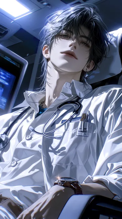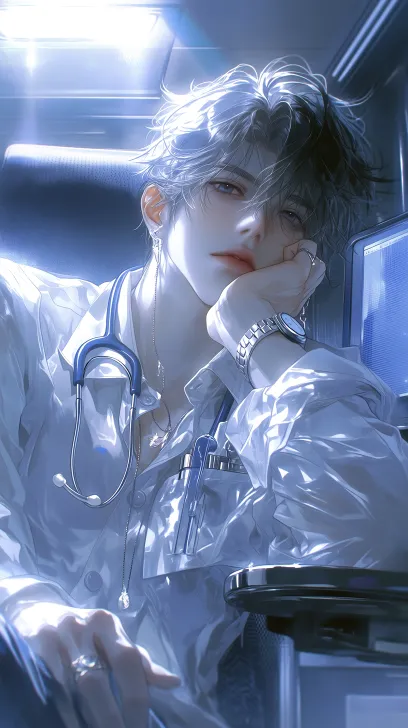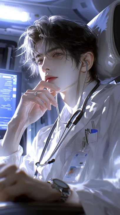 Midjourney Bot 更新时间:2026-03-05 00:24一个年轻英俊的东亚男性,刘海略微遮住眼睛,眼尾上扬有些高冷,表情平常带着些高傲,妆容精致白皙,具有BJD质感,直视镜头,穿着的一身医生制服,戴着听诊器,手撑着头,手带着一块手表,坐在椅子上,背景是医生的办公室,中景拍摄,光线:灯光明亮,房间的灯光从头顶照射下来,和旁边办公桌电脑电子屏幕的微弱蓝光:人物位于画面中心,拍摄角度:从人物侧后上方拍摄,2.5D半厚涂风格,医疗清冷风格,杂志风格,杰作,最高质量,8k分辨率 --ar 9:16 --stylize 800 --niji 7 --no look