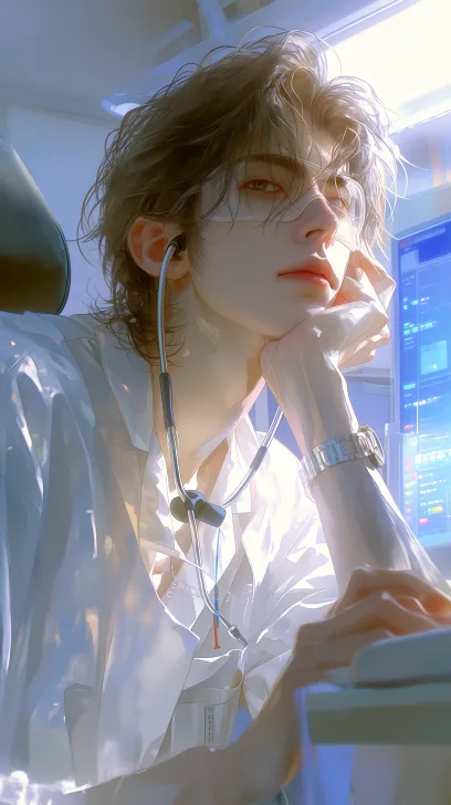 Midjourney Bot 更新时间:2026-03-05 00:27一个年轻英俊的东亚男性,浅棕色刘海分成三七分,一只眼睛带着白色医疗眼罩,表情放松带着些柔和,妆容精致白皙,具有BJD质感,直视镜头,穿着的一身医生制服,戴着听诊器,手撑着头,手带着一块手表,坐在椅子上,背景是医生的办公室,中景拍摄,光线:灯光明亮,房间的灯光从头顶照射下来,和旁边办公桌电脑电子屏幕的微弱蓝光:人物位于画面中心,拍摄角度:从人物侧后上方拍摄,2.5D半厚涂风格,医疗清冷风格,杂志风格,杰作,最高质量,8k分辨率 --ar 9:16 --stylize 800 --niji 7 --no look