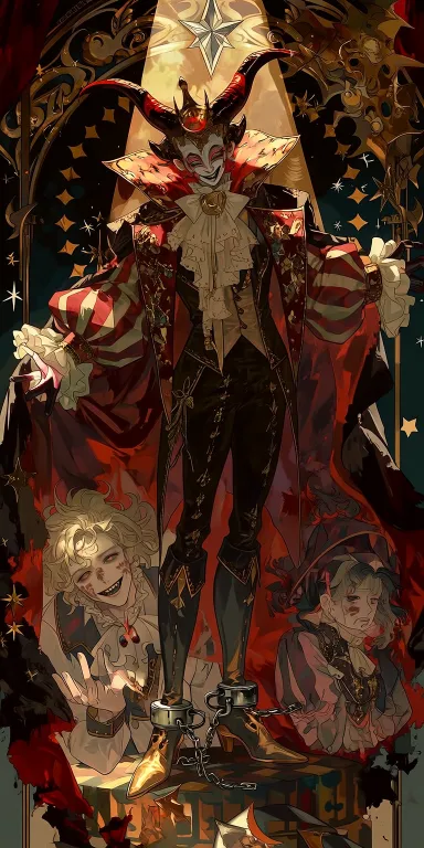Midjourney Bot 更新时间:2026-03-06 00:00https://images.gogpt.vip/aigf/m_origin/20260305/2075046/92r04etgoks1vjrp.jpg https://images.gogpt.vip/aigf/m_origin/20260305/2075046/j40li59sud5d8298.jpg https://images.gogpt.vip/aigf/m_origin/20260305/2075046/59bipae1gm7xegq8.jpg 商业插画渲染,二次元塔罗风格,神秘主义元素,中世纪花纹装饰,马戏团元素装饰,月亮元素。中央站着一位恶魔马戏团领班,头戴扭曲公羊角,身穿破旧华丽红色礼服,面带蛊惑微笑。他站在聚光灯下的舞台上,脚边锁着两个表演者:一个悲伤的纹身大力士和一个哭泣的女演员,锁链松弛象征虚幻禁锢。背景是诡异游乐 --ar 1:2 --stylize 217 --iw 0.25 --niji 7