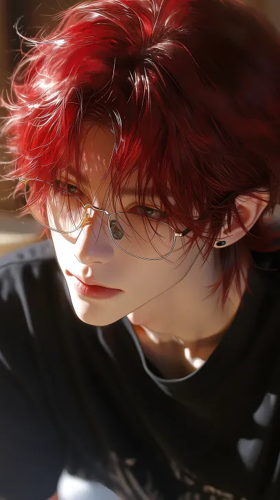 Midjourney Bot 更新时间:2026-03-06 00:07高级CG bjd 少年 26岁左右 高级厚涂 头发蓬松发丝凌乱 高清画质 光从侧面打过来 刘海过眉 冷白皮 耳环 眼尾向下 高鼻梁 薄唇 漫画感 涂画风 细腻晕染 朦胧 面部柔焦 高分辨率 笔触 插画 不羁 叛逆 嘴唇水润 俯视 立体打光 人物放大脸部特写 红色头发 黑色T恤 戴着金丝框眼镜 背景房间 夜晚 坐在地上, --ar 9:16 --stylize 800 --niji 7