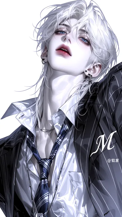Midjourney Bot 更新时间:2026-03-06 00:08半写实动漫厚涂风格 线条流畅 逼真质感 一个帅气的男人 金发 “M”字刘海造型 五官精致 发丝根根分明 睫毛根根分明 冷色调 西装(哑光细节质感+领带) 性感禁欲风格 发型蓬松有造型 少年感一些 鱼眼镜头 微俯视视角 半身照中景长肖像 树脂娃娃肌肤 黑色桃花眼 高鼻梁 薄唇 肌肉线条流畅 八块腹肌 非常桀骜不驯的样子 --ar 9:16 --stylize 553 --niji 7 --profile fcki22e