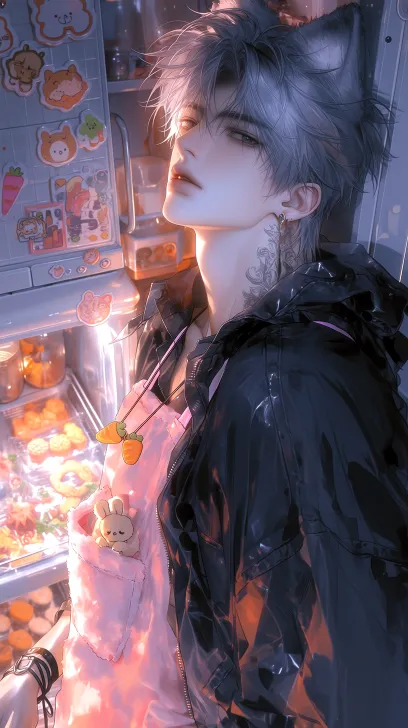 Midjourney Bot 更新时间:2026-03-06 00:09半写实风格,伪厚涂拟真,2.5d,酷帅男生,面部特写半身,男银灰色狼尾发,微湿凌乱,瓜子脸,锁骨处蔓延的藤蔓纹身,宽肩窄腰,上半身穿黑色修身针织衫,袖子挽到手肘,露出小臂线条,外面却套着一件毛茸茸的粉色兔子围裙,围裙口袋里还塞着一个胡萝卜玩偶,动作是双手抱臂靠在厨房料理台边,眉头微蹙,一脸不耐烦地看着镜头,表情又冷又嫌弃,饰品包括脖子上挂着一条卡通胡萝卜项链,手腕上缠着黑色皮绳,背景是可爱的甜品厨房,身后料理台上摆着各种卡通模具、彩色糖针、小熊形状的饼干,冰箱上贴满了小猫小狗的磁贴,烤箱里透出暖黄色的光,对角构图,眼睛细长冷漠,侧上方俯拍突出那张冷脸和滑稽围裙的反差 --ar 9:16 --stylize 300 --niji 7 --profile jktkk9o --no 下半身,过长的手指,动物