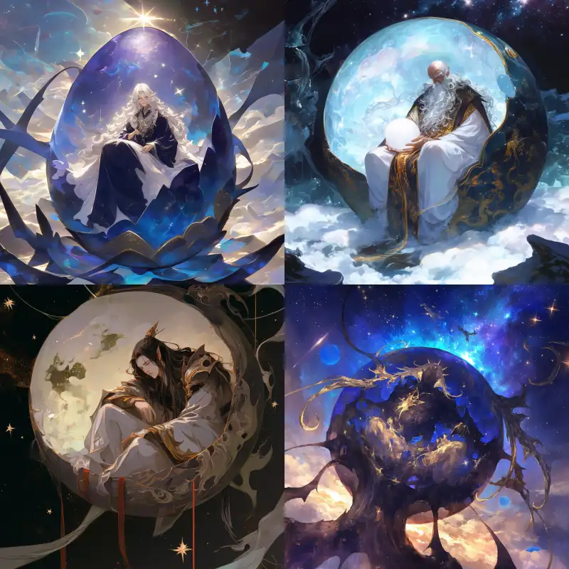 Midjourney Bot 更新时间:2024-09-30 00:11In the endless chaotic universe, a magnificent man, Pangu, sits solemnly in a huge egg shaped environment, surrounded by twinkling stars like whispering elves. He was adorned with dazzling starlight, and his face revealed a thousand years of wisdom and exhaustion. The pitch black space seems to be oppressed, suffocating. Pangu closed his eyes and pondered, finally awakening in a state of silence. His hands tightly grasped the shell wall, his muscles tightened, and he erupted with a shocking force. He exerted all his strength, and the eggshells cracked with a loud sound, instantly radiating light. Heaven and earth parted, and light matter transformed into soft clouds, while heavy matter sank into towering earth. At this moment, the universe was reborn, and miracles and creations intertwined, making people hold their breath and stare. --niji 6 --ar 1:1