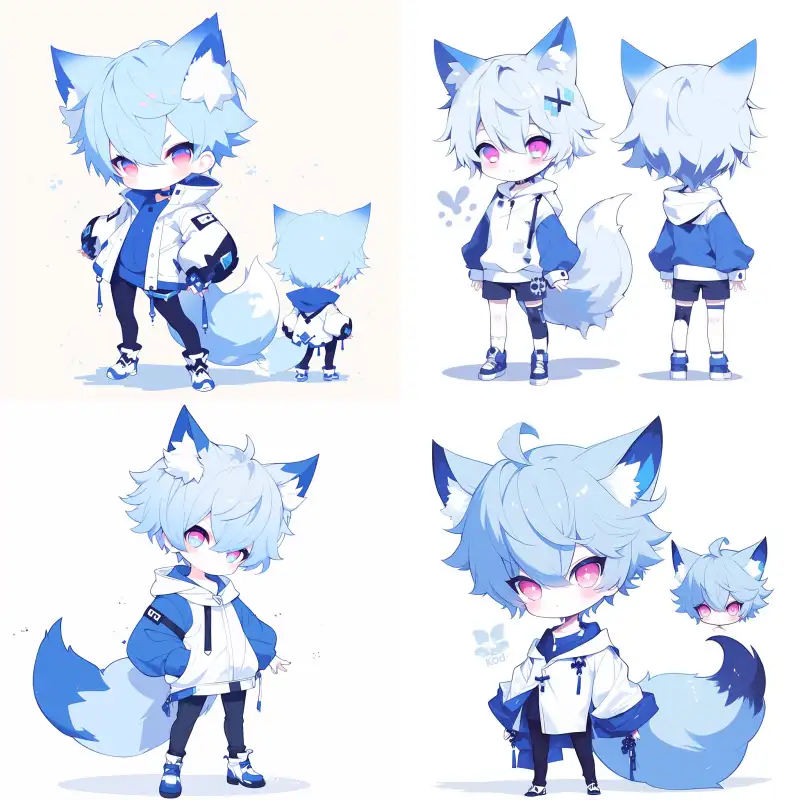 Midjourney Bot 更新时间:2024-09-28 00:06Subject: Cartoon IP Character Design Gender: Male Features: Fox ears and fox tail Hair: Light blue short hair, neat and stylish Eyes: Pink-blue eyes, exuding the cold beauty of an ice queen Clothing: Blue and white clothing, with a simple and fashionable design, suitable for Q version style Style: Q version, reflecting a combination of cuteness and personality Views: Including front, side, and back views, clearly showing the character from various angles Action: Confident and elegant posture, possibly slightly lifting the head or casually crossing the arms Expression: Cold but with a hint of gentleness, showcasing the character's unique charm 16K, --sref