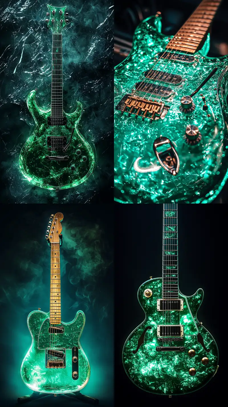 Midjourney Bot 更新时间:2024-09-27 00:03Electric guitar, jade texture, internally glowing, glossy finish, high-definition, product photography, --v 6.1 --ar 9:16 --s 150 --quality 2