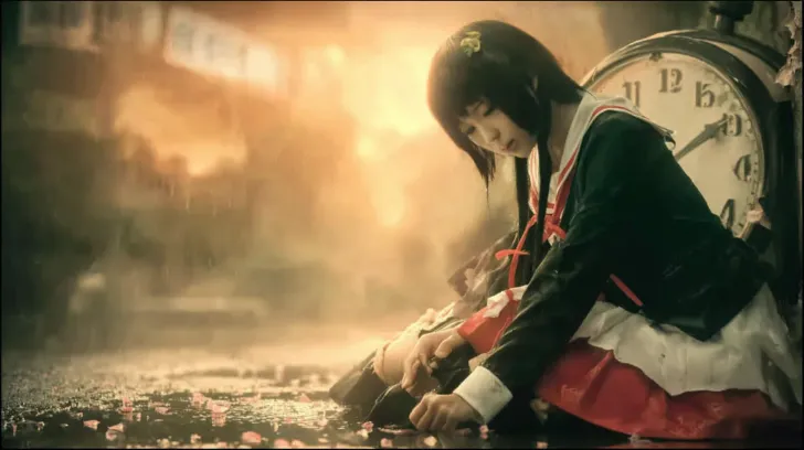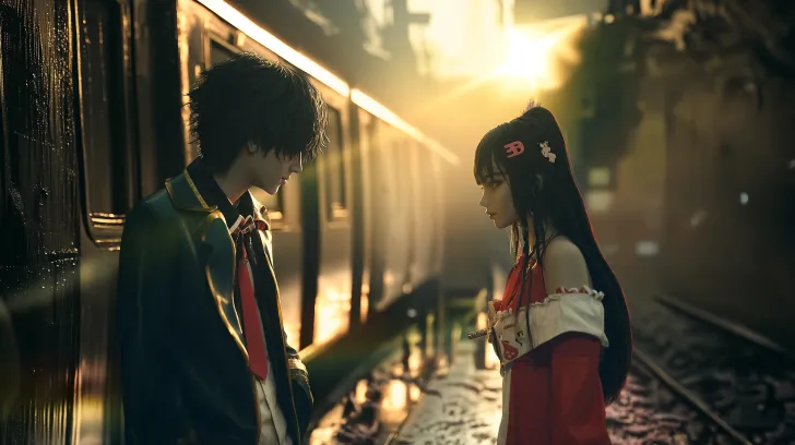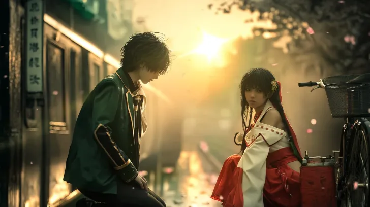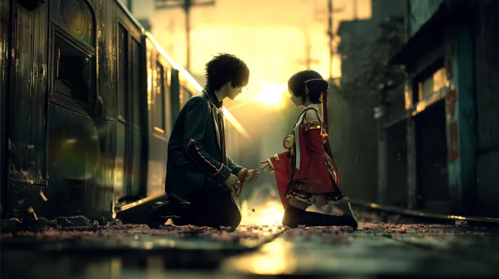 Midjourney Bot 更新时间:2026-02-24 00:14电影剧照,《龙族幻想》中的路明非与上杉绘梨衣。 路明非身穿黑色风衣,金色的瞳孔流出眼泪,跪倒在一个枯井旁,双手报住死去的上杉绘梨衣,无声抽泣。 上杉绘理身穿红白相间的巫女服饰,手中还有一个刻着Sakura & 绘梨衣 Duck‘’的小黄鸭,但已无力握住,死在路明非怀里(躺在路明非怀里) 场景:黄昏时分的老枯井、雨夜、湿漉漉的地面映出倒影、散落着的樱花花瓣、延伸至远方的广告牌。 照明:金色的阳光透过薄雾洒落,温暖的后景光,强烈的对比效果,营造出忧郁而伤感的情调。侧视图 人物路明非:超高细节,CG质感,日系动漫风美少年,黑灰短发微乱有层次感,侧脸线条干净利落,眼神沉静略带忧郁,眼睛瞳孔为赤金色,肤色偏冷白,身着黑色日式风衣外套,袖口与领口有金色镶边装饰,内搭白色衬衫与深色领带,下身深色长裤,跪在潮湿的老枯井旁。双手抱着上杉绘梨衣,姿态痛苦又绝望,背景是雨后黄昏的雾气与暖黄逆光,发丝被水汽打湿,皮肤纹理细腻,电影级光影,8K超清,氛围感拉满,清冷又怀旧。 人物上杉绘梨衣:超高细节,CG质感,和服巫女少女,乌黑长发,发间系着红色发带,唇色淡粉,肤色白皙通透,身着传统红白巫女服,白色上衣配红色袴裙,袖口与衣摆有精致的红色镶边,手中已经无力握住上面刻着Sakura & 绘梨衣 Duck‘’的小黄鸭,绘梨衣死在路明非怀中,双目紧闭,赤足,衣袂被晚风轻轻拂动,周身被暖黄逆光与雾气包裹,发丝与衣料上有细密的水珠,皮肤纹理细腻,发丝根根分明,电影级光影,8K超清,空灵又神秘,充满宿命感。 风格:写实动漫风格、电影级质感、精细纹理、景深效果轻微、对称构图、8K分辨率、超精细细节。 --ar 16:9 --v 7 --style raw --stylize 58 --oref https://images.gogpt.vip/aigf/m_origin/20260223/2063102/1jjek3ytlljt35sp.png --ow 206 --no 他们不能对视,不能面对面