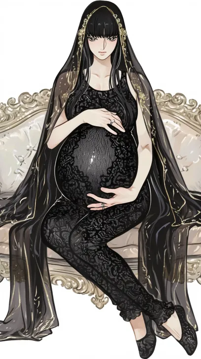 Midjourney Bot 更新时间:2026-02-24 00:06CLAMP浮世绘风格,怀孕,一个黑金色刘海(刺绣镶foil)hime cut长发穿着黑色蕾丝皮制泳装婚纱、戴着银戒指、手指修长的英俊男子,(全身肖像),坐在沙发上,古威兹完美的双手,细致的眼睛,封面时尚艺术风格的插图,白色背景,漫 --ar 9:16 --style raw --stylize 100 --niji 6 --no no