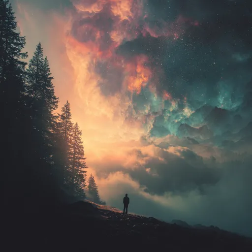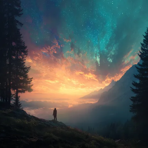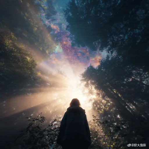 Midjourney Bot 更新时间:2026-02-24 00:08一个人在远处仰望天空,森林,暖阳,梦核,朦胧,发光,梦里的感觉,有风,享受 超现实主义, --ar 1:1 --v 7 --stylize 100