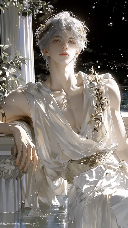 Midjourney Bot 更新时间:2026-02-24 00:09韩式半厚涂,2.5d,Cg,真人感,1boy,东方美少年, 纤细匀称, 冷白皮, 银灰色中分长发, 柔顺丝滑, 根根分明, 看镜头,长睫毛, 水润唇,平静安详, 他躺在古希腊大理石卧榻, 胳膊搭在旁边的河畔里,白色古希腊短斗篷,白色亚麻腰布,单侧肩带,裸露一侧肩膀,金色月桂装饰,在河畔, 月桂树, 月桂叶, 白色丝绸, 柔和月光, 银色光点, 暗黑氛围, 厚涂, 高清, 8k, 极致细节, --ar 9:16 --weird 289 --stylize 1000 --niji 7 --no Elf,精灵耳