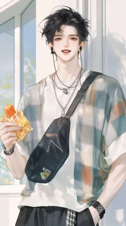 Midjourney Bot 更新时间:2026-02-24 00:11男生银发带着无线黑色耳机,单肩挎着黑色背包,阳光照耀,手里拿着棒棒糖 --ar 9:16 --stylize 100 --niji 7 --profile bt5yavm --no side profile和close-up of facial features