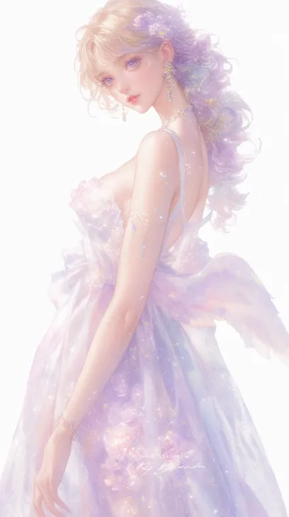 Midjourney Bot 更新时间:2026-02-24 00:14一个美丽的女孩子,面容精致较好,展现出浪漫和梦幻的氛围。穿着华丽的浅粉金色礼服,白皙的皮肤,裙子上面采用轻盈的材质,装饰着闪闪发光的细节,下面是一个大大用裙撑的裙摆,流露出优雅与仙气。一头金黄的长发,点缀着细腻的光泽,增添了贵族气息。有一对天使翅膀 --ar 9:16 --style raw --stylize 523 --niji 6 --sref https://images.gogpt.vip/aigf/m_origin/20260223/1748129/xzu24tr7ydzoinqc.jpg --sw 1000 --profile cufsr7t