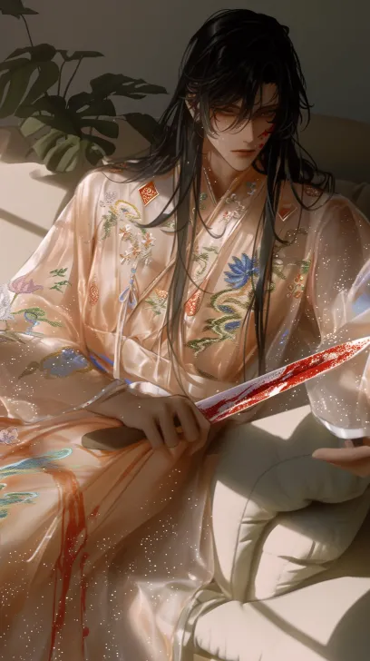 Midjourney Bot 更新时间:2026-02-24 00:15一名英俊俊美的身穿桃红色色刻丝透视汉服的动漫男性,手持沾有红色液体的刀。红色液体也溅到了他的脸上,刺绣花纹+八宝纹+宝相花纹+云纹、水纹、青莲、海棠、藤蔓、山水纹,白色背景,随机点,多次曝光摄影玫瑰,柔光,长发,,线条流畅➕阴影柔和,胶片颗粒感,长发,坐在沙发上,在灰暗的房间里,脸上有阴影,黑色的头发,肌肉发达,黑色嘴唇,高角度拍摄,全身肖像, --ar 9:16 --style raw --stylize 100 --niji 6 --no no