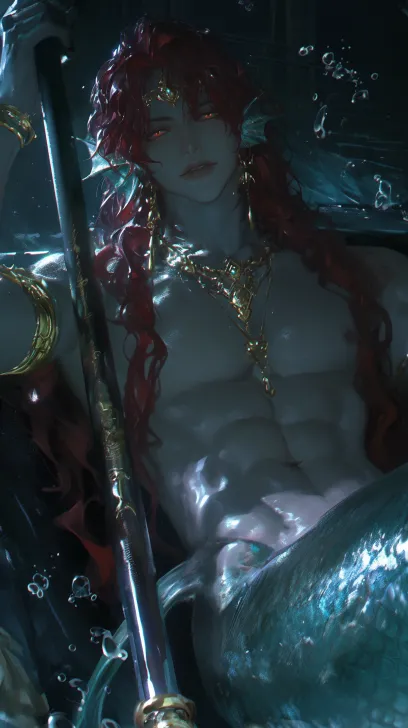 Midjourney Bot 更新时间:2026-02-24 00:17一位非人类男性人鱼,俊美,红色的长发,鱼鳍耳朵,五官精致立体,眼神充满诱惑,上半身肌肉线条优美,佩戴着金色的项链,肩部鱼鳞闪烁着光芒,深海王宫背景,周围有气泡漂浮,坐在王座之上,正面视角,中景构图,厚涂二次元插画,高细节,8k分辨率,虚幻引擎5渲染风格,电影级质感,柔和侧光,高光反射,暗黑系,性感,精致。 --ar 9:16 --stylize 338 --niji 6 --sref https://images.gogpt.vip/aigf/m_origin/20260223/1641788/9pxyelm67vdpyatf.png --sw 0 --sv 3 --profile 55pwzjj spr1pcg