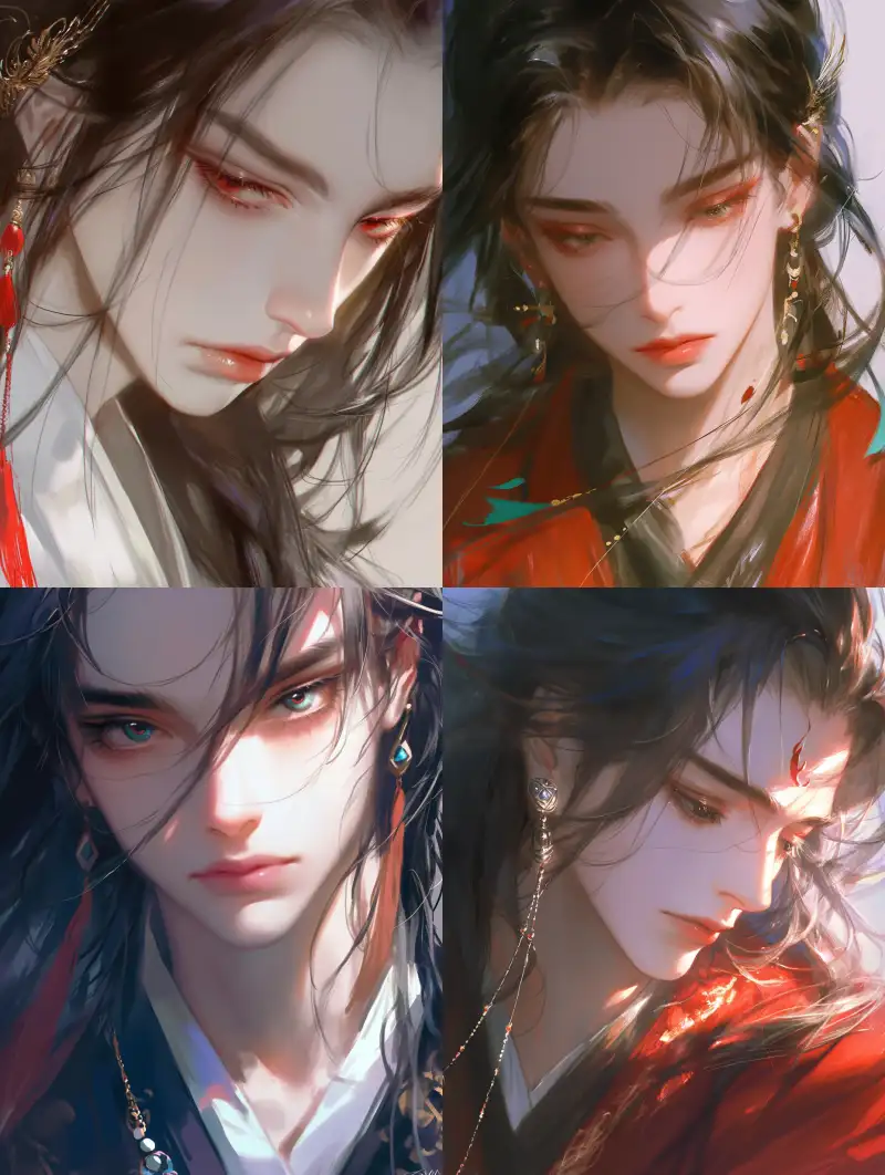 Midjourney Bot 更新时间:2024-09-22 00:03Close-up of the face, long eyelashes, Hanfu, long hair, black hair, (((translucent))), close-up of the eyes, quick sketch of red lips, earrings, beaded necklace, male, handsome guy --niji 6 --ar 3:4