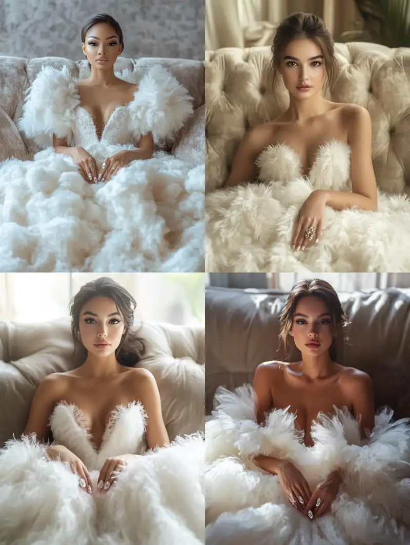 Midjourney Bot 更新时间:2024-09-18 00:05A beautiful woman wearing a super fluffy white princess dress sits on a soft sofa, facing directly forward, looking at the camera, with exquisite nails, her hands elegantly placed on the hem of her dress, ultra-high detail, high resolution, extreme detail, RAW photo, subject, 8k uhd, DSLR, soft lighting, high quality, film grain, Fujifilm XT3, (realism:1.2), taken with Canon EOS 5D Mark IV, facial details, hair details, bokeh --v 6.1 --ar 3:4 --style raw --no rim light,Strong light