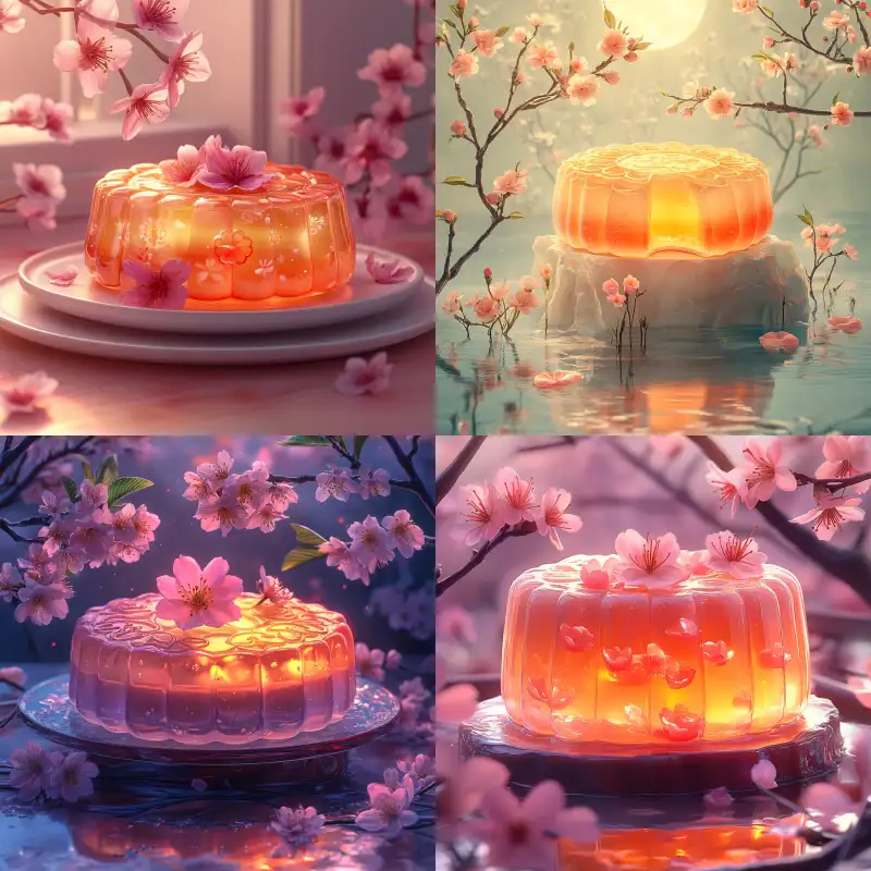 Midjourney Bot 更新时间:2024-09-17 00:04Masterpiece, aesthetics, minimalist detailed hyper-realistic cartoon illustration, glowing transparent jelly cute crystal mooncake, lower half immersed inside the mooncake, cherry blossoms, glowing, transparent layers, naive shapes and forms, soft edges, gentle colors, in a soft color style, high resolution. --v 6.1 --ar 1:1 --s 396