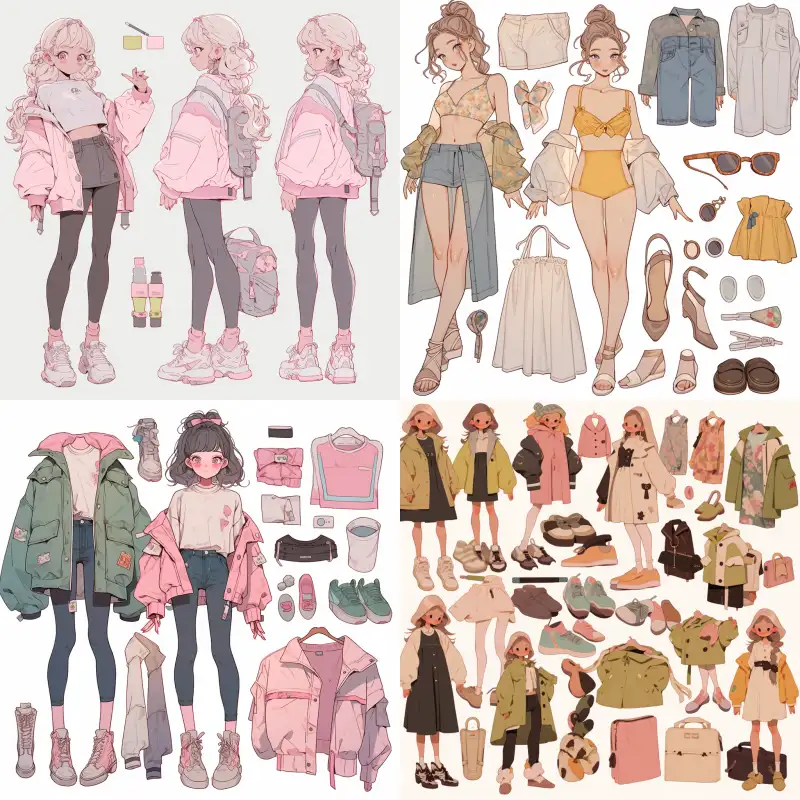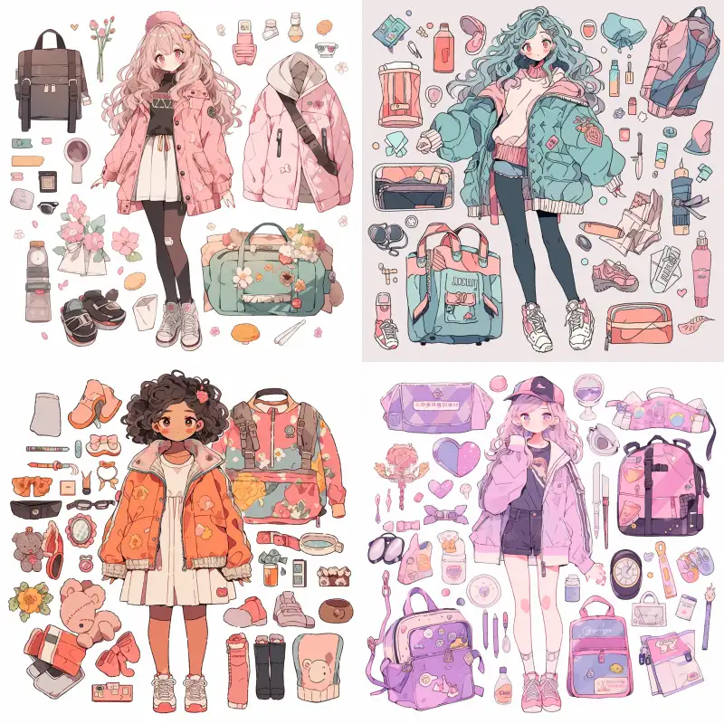 Midjourney Bot 更新时间:2024-09-17 00:05Girl Style Clothing Design knolling::9 , --niji 5 --ar 1:1