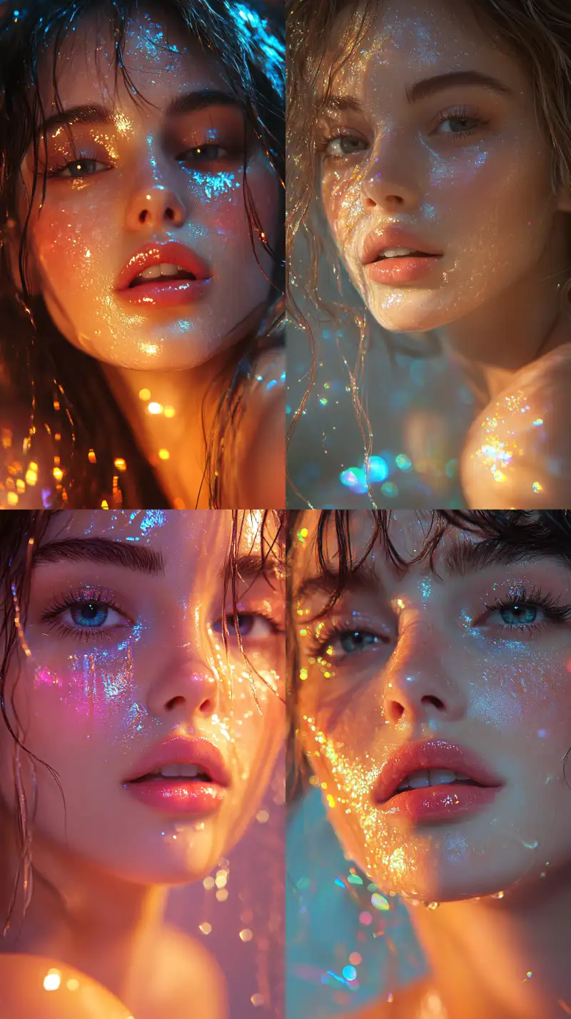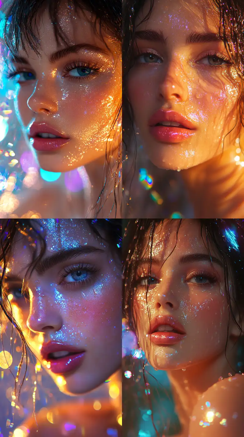 Midjourney Bot 更新时间:2024-09-16 00:05A beautiful woman, looking at the camera, light reflecting on her skin. Her hair is wet, and her lips are shiny. She has long eyelashes, and the background sparkles with colorful light effects. The skin is glossy, with a soft focus appearance, and the lighting is cinematic, with a prime time effect, creating a dreamlike fantasy style atmosphere. It has the aesthetic of a fashion magazine cover. High detail, photography, ultra-clear details, cinematic lighting, complex shadows, rich colors, unique facial features, intricate emotions, Canon EOS R5 F2 ISO300 85mm style. Best quality, ultra HD, delicate skin texture, full makeup. --v 6.1 --ar 9:16 --style raw --s 391 --c 8
