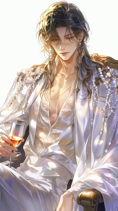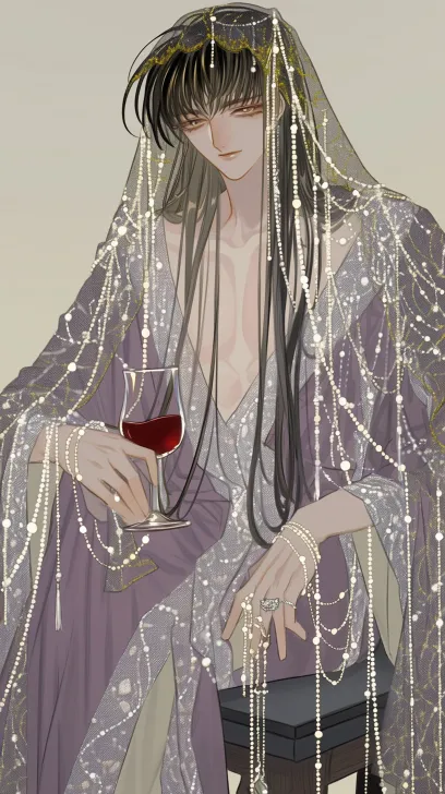 Midjourney Bot 更新时间:2026-02-22 00:12:CLAMP风格浮世绘,一个留着长发和金色刘海的男人,穿着睡袍,拿着红酒杯,白色,saint,穿着一件紫罗兰色光泽感珍珠缎面的蕾丝朝觐布,肩上挂着银珠和珍珠,灵感来自丝绸,饰有钻石,脸上戴着精致的面纱。顶部由白色珍珠刺绣制成,每肩上都有大量的珠饰和银色珠饰流苏,从两侧向下延伸。金线、银线、白皙皮肤,长长微卷黑发,肌肉发达,柔和的光线,坐在椅子上 --ar 9:16 --stylize 100 --niji 7 --no no