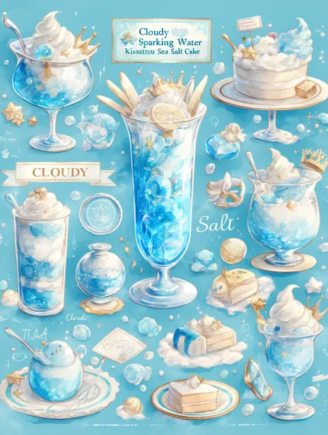 Midjourney Bot 更新时间:2026-02-22 00:15日式手绘水彩风甜品菜单插画,高浓度水彩肌理质感,晕染笔触明显,主题“云之气泡水”,浅蓝+奶白清新治愈色调,主体:渐变蓝色玻璃杯装气泡水(杯身日文“喫茶シキリ”,顶部云朵奶油+星星/皇冠/气泡)、右侧蓝白千层蛋糕(标注“海塩ケーキ”)、底部玻璃盘甜品拼盘(奶油+覆盆子+饼干+云朵棉花糖);辅助:左侧“雲の物語”竖排字+3个小插画,右上角“CLOUDY TIME”复古标签框;超精细刻画 --ar 3:4 --stylize 400 --niji 6