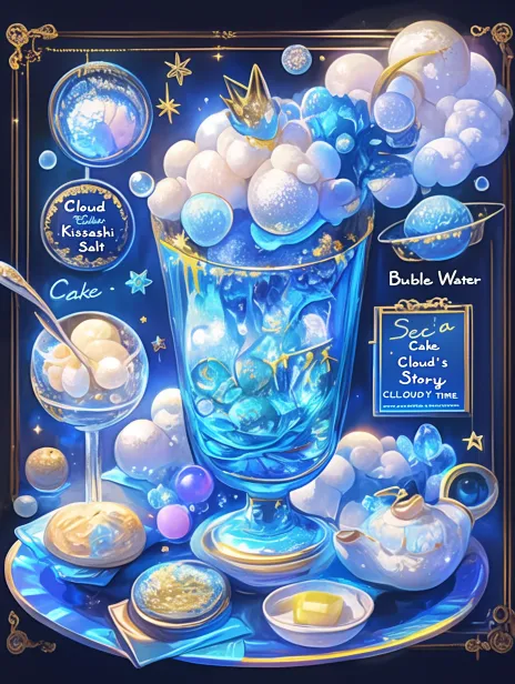 Midjourney Bot 更新时间:2026-02-22 00:15日式手绘水彩风甜品菜单插画,高浓度水彩肌理质感,晕染笔触明显,主题“云之气泡水”,浅蓝+奶白清新治愈色调,主体:渐变蓝色玻璃杯装气泡水(杯身日文“喫茶シキリ”,顶部云朵奶油+星星/皇冠/气泡)、右侧蓝白千层蛋糕(标注“海塩ケーキ”)、底部玻璃盘甜品拼盘(奶油+覆盆子+饼干+云朵棉花糖);辅助:左侧“雲の物語”竖排字+3个小插画,右上角“CLOUDY TIME”复古标签框;超精细刻画。 --ar 3:4 --stylize 400 --niji 6