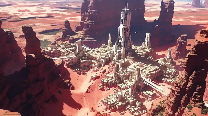 Midjourney Bot 更新时间:2026-02-22 00:17帮我生成一张未来世界的插画,人迹罕至,建筑物极少并且极小【2-3座】并且与自然地形相融合,建筑物不要太先进高级,可以借鉴各国的古建筑元素,红色风蚀地形,大块岩石与沙地裸露,视角:从天空俯视,视野宽阔色彩对比强,光照强,有明显的光影,整体色调略亮, --ar 16:9 --weird 261 --stylize 172 --niji 7 --sref https://images.gogpt.vip/aigf/m_origin/20260222/2061540/kc6tmfk1agnue0wy.jpg --sw 32