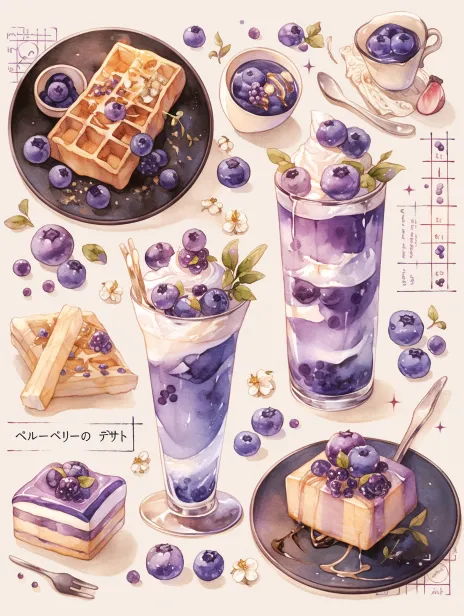 Midjourney Bot 更新时间:2026-02-22 00:22日式手绘水彩风甜品菜单插画,高浓度水彩肌理质感,晕染笔触明显,上方是流心蓝莓吐司(淋紫酱、点缀蓝莓,放黑盘+紫格餐布),;下方是三款小甜品:蓝莓三色蛋糕、蓝莓司康、蓝莓奶油蛋糕(带可爱表情),并标注日文“ブルーベリーのデザート”和中文描述。边框带精致花纹,文字描述,超精细刻画。 --ar 3:4 --stylize 400 --niji 6